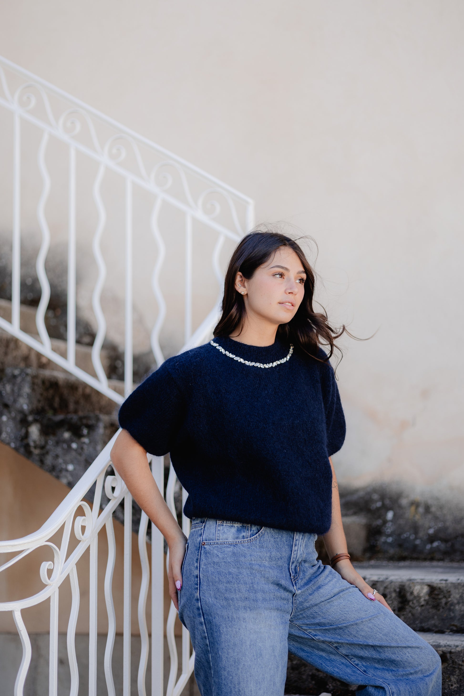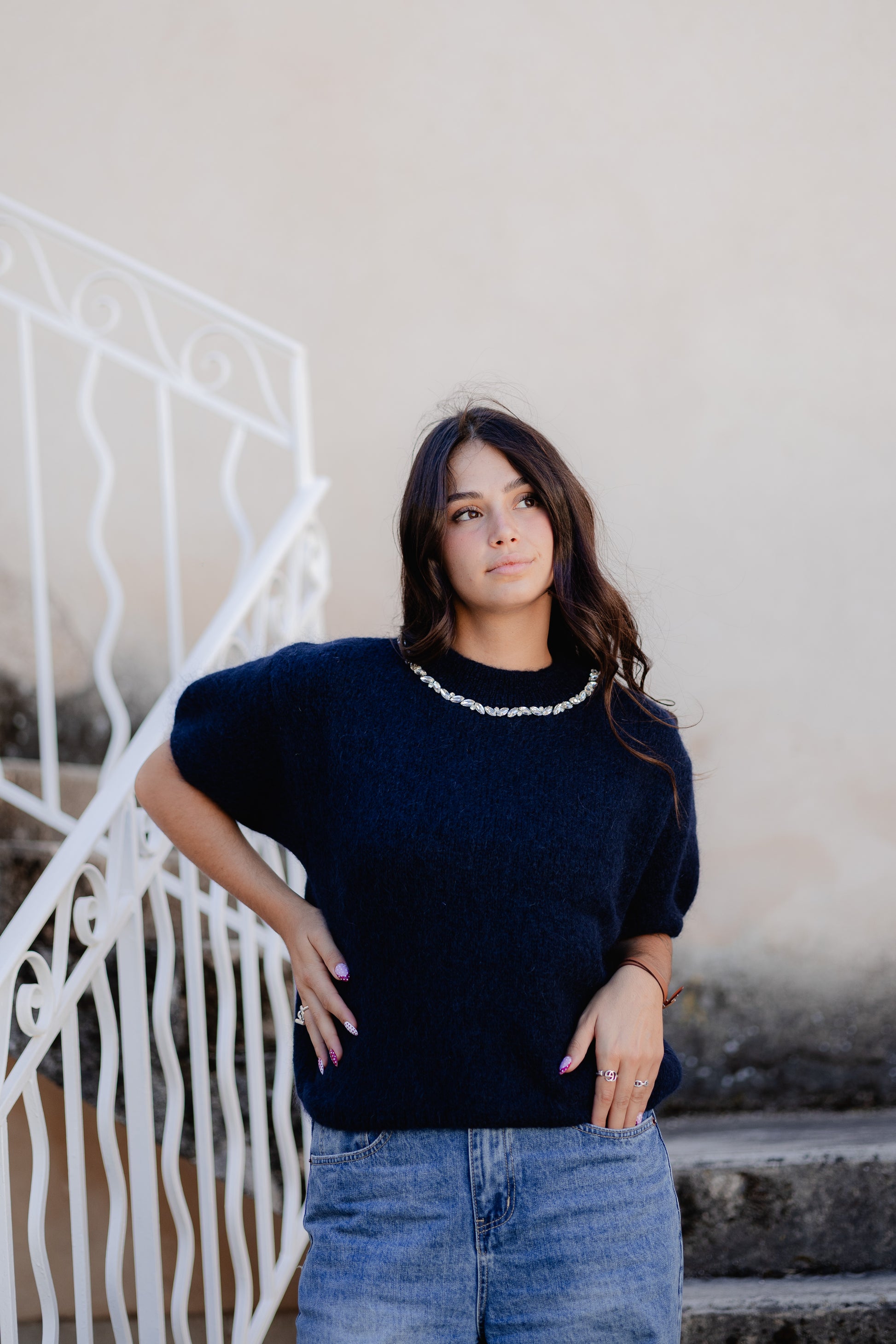 - Élégant pull mohair bleu marine pour cet automne.